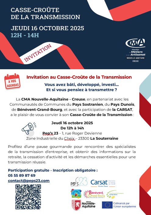 La CMA Nouvelle Aquitaine – Creuse, en partenariat avec les Communautés de Communes du Pays Sostranien, du Pays Dunois, de Bénévent Grand-Bourg et avec la participation de la Carsat, à le plaisir de vous convier à son Casse-croûte de la Transmission.